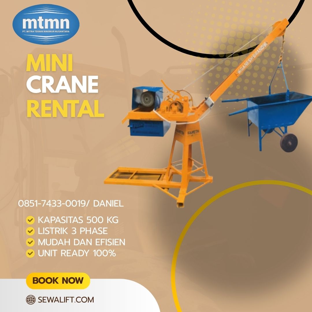 Kami dari PT. Mitra Teknik Makmur Nusantara (MTMN) menyediakan layanan rental Mini Crane berkualitas tinggi dengan kondisi unit siap pakai 100% dan performa optimal.