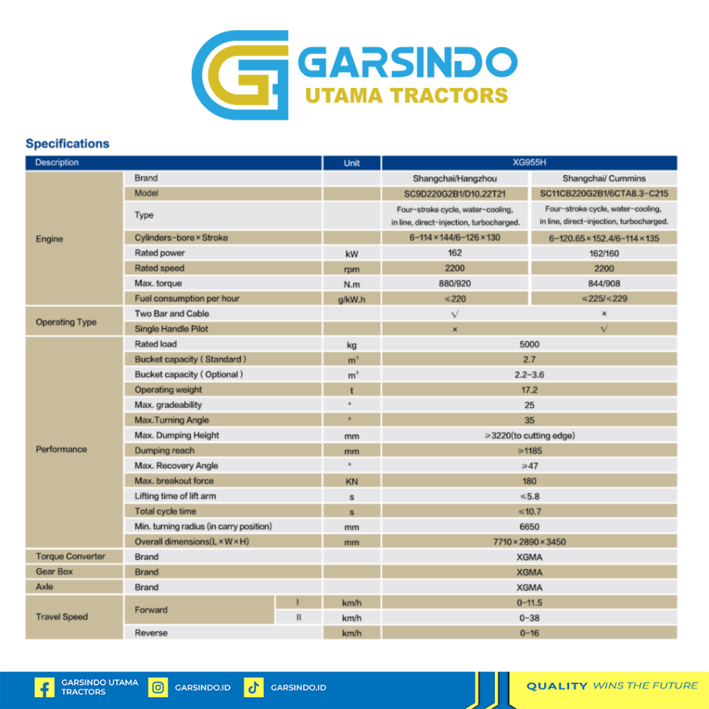 Jika Anda mencari harga wheel loader terbaik di kelasnya, XGMA XG955N dari PT. Garsindo Utama Tractors adalah pilihan cerdas. Dengan harga alat berat yang bersaing, performa tinggi, dan daya tahan maksimal, unit ini terbukti mampu bekerja di medan berat dengan efisiensi luar biasa.